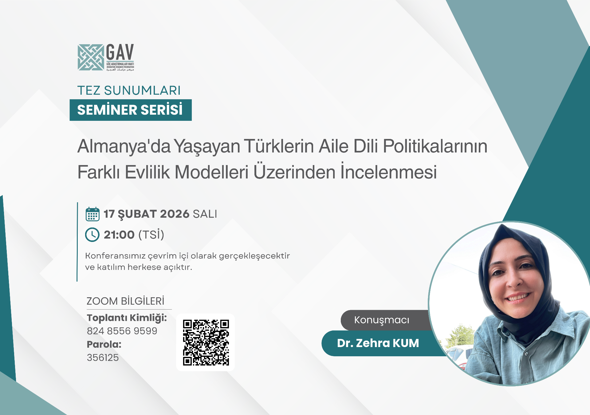 Dr. Zehra Kum, 17 Şubat 2026 Salı günü Türkiye saati ile 21:00’de “Almanya’da Yaşayan Türklerin Aile Dili Politikalarının Farklı Evlilik Modelleri Üzerinden İncelenmesi” konulu tez ...
