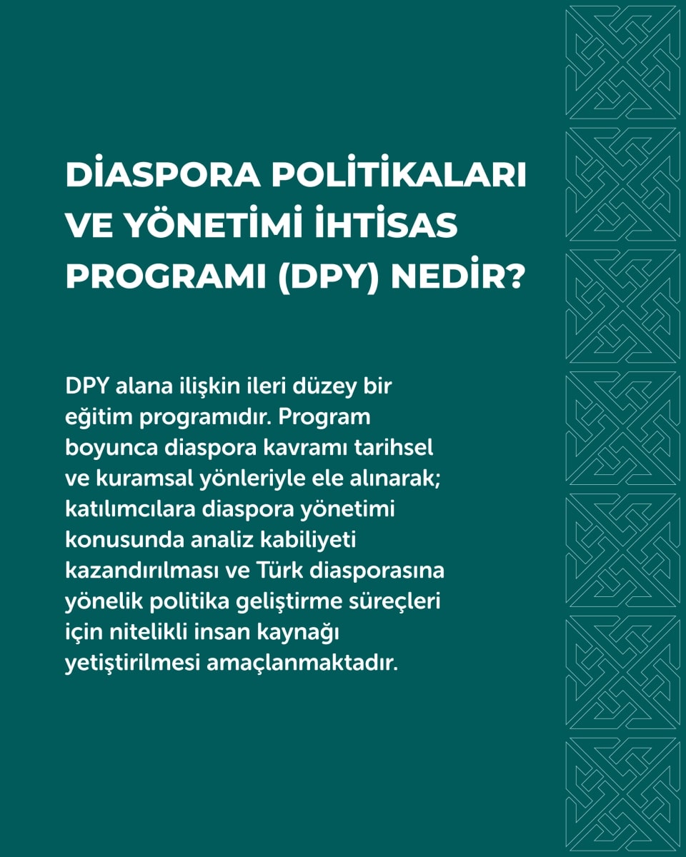 ● Türk diasporasına yönelik politika geliştirme süreçlerinin anlamlandırılması ve bu alanda kamu kurumları, sivil toplum yapıları ve akademik çevreler için nitelikli insan kaynağı yetiştirilmesi amaçlanmaktadır.