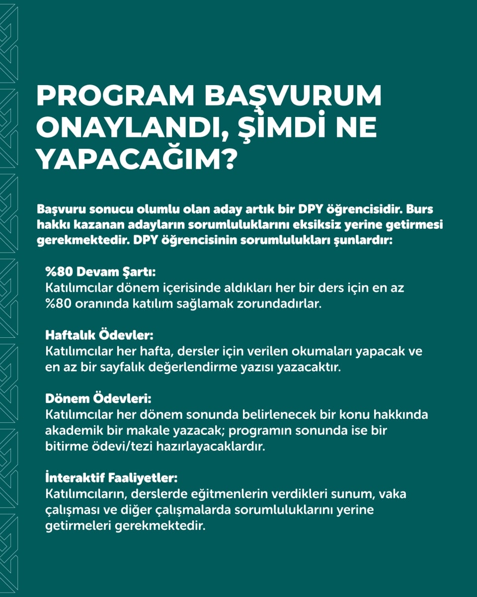 ● Katılımcılar dönem içerisinde aldıkları her bir ders için en az %80 oranında katılım sağlamak zorundadırlar.