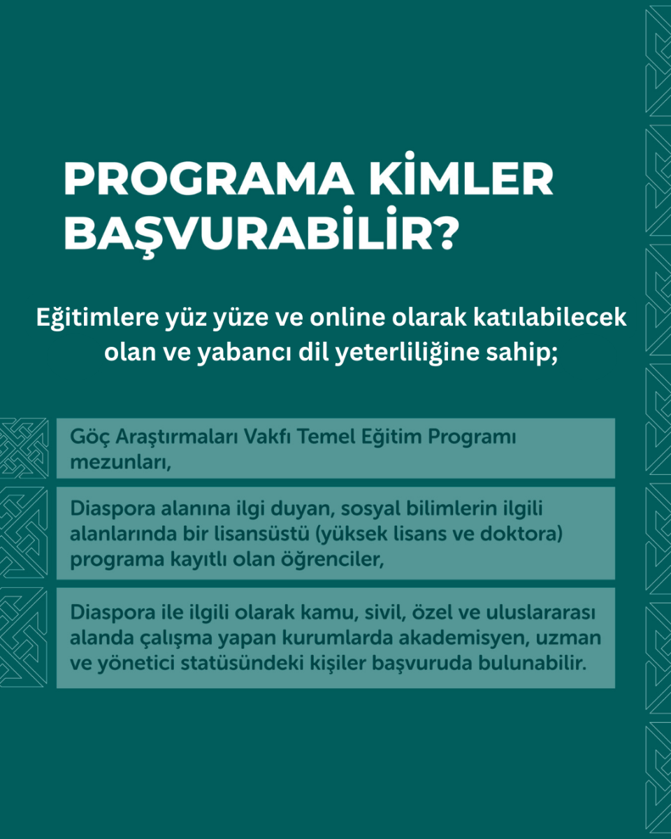 ● Türk diasporasına yönelik politika geliştirme süreçlerinin anlamlandırılması ve bu alanda kamu kurumları, sivil toplum yapıları ve akademik çevreler için nitelikli insan kaynağı yetiştirilmesi amaçlanmaktadır.
