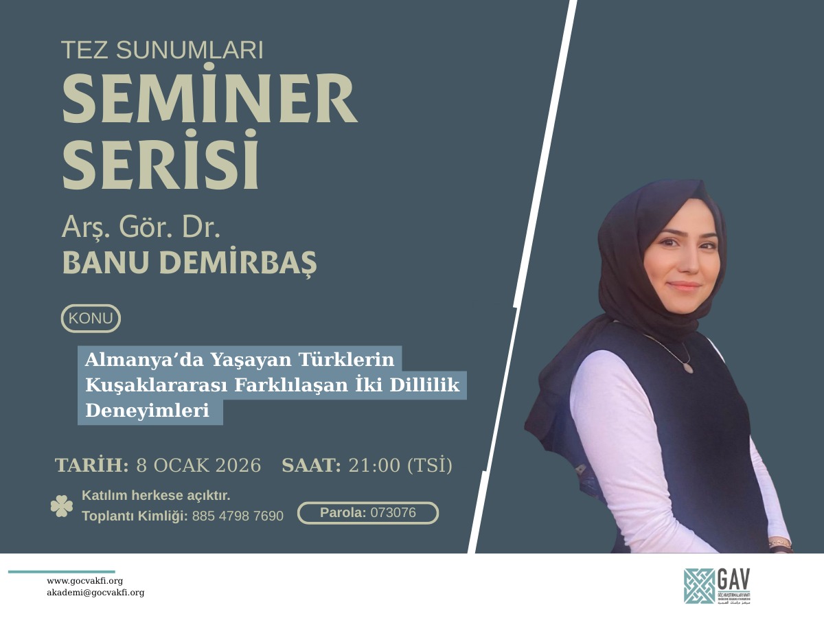 Dr. Banu Demirbaş, 8 Ocak 2026, Perşembe günü saat 21:00’de (TSİ) “Almanya’da Yaşayan Türklerin Kuşaklararası Farklılaşan İki Dillilik Deneyimleri” başlıklı semineriyle bizlerle olacak.